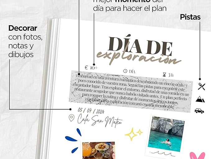 Cada reto se convierte en un momento para recordar. Incluye espacio para pegar fotos, escribir anécdotas y transformar el libro en una cápsula de vuestra historia juntos.